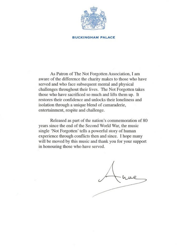 HRH Princess Anne has released a statement from Buckingham Palace supporting the single ‘Not Forgotten’. As Patron of The Not Forgotten, HRH Princess Anne has always played a close interest in our events and initiatives. After being made aware of the charity single ‘Not Forgotten’, Her Royal Highness said: